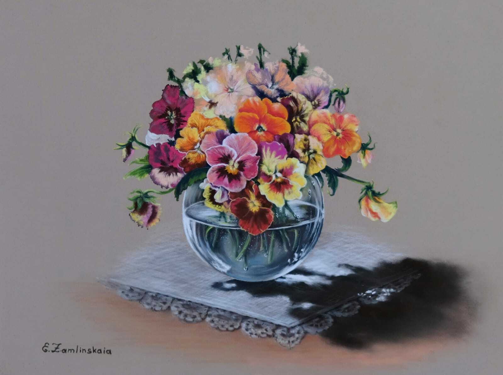 "Виолы в стеклянной вазе", пастель, бумага, 40 × 50 см